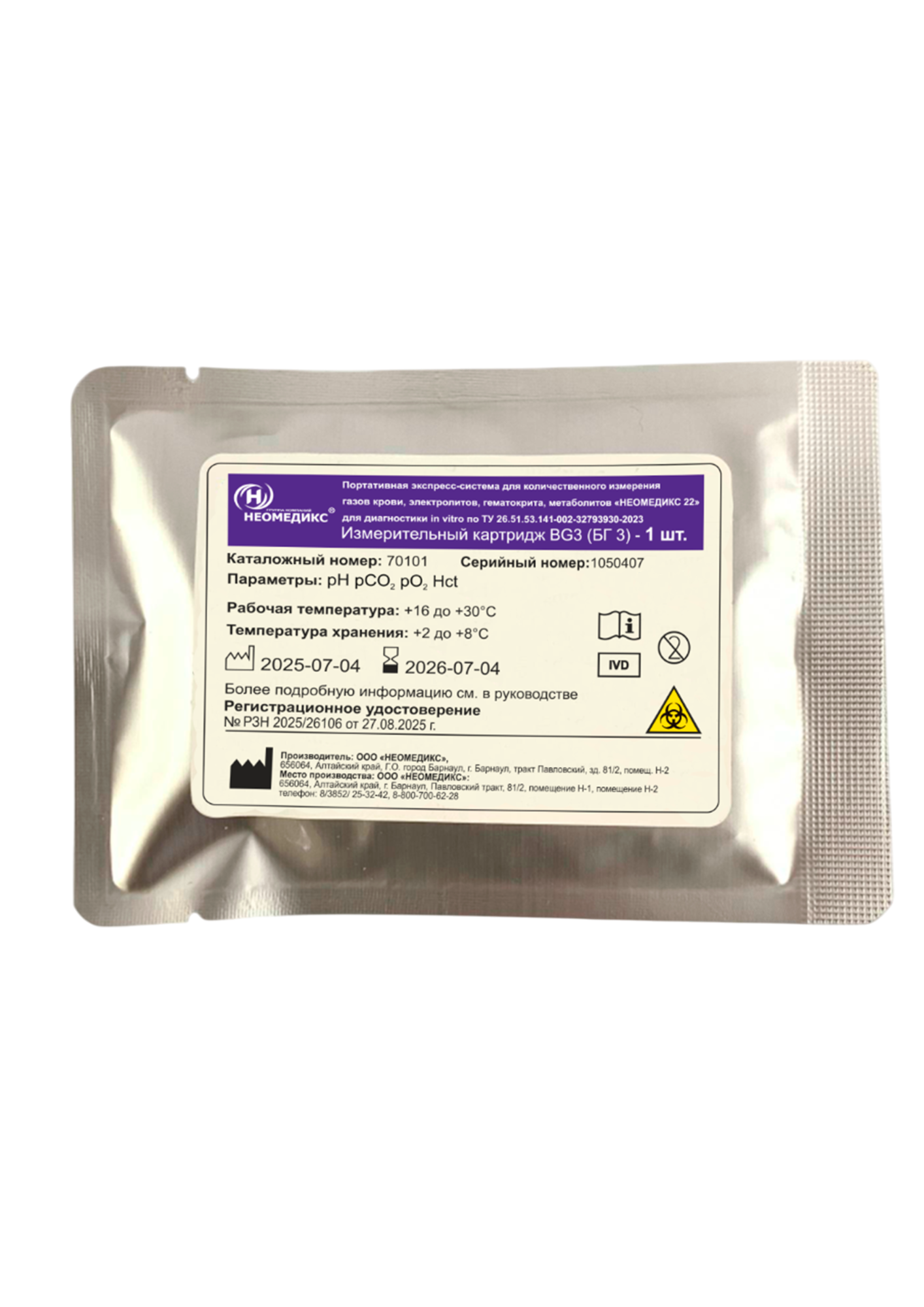Картридж тип: БГ 3 (BG 3) — измерительный картридж для анализатора газов крови "НЕОМЕДИКС 22"