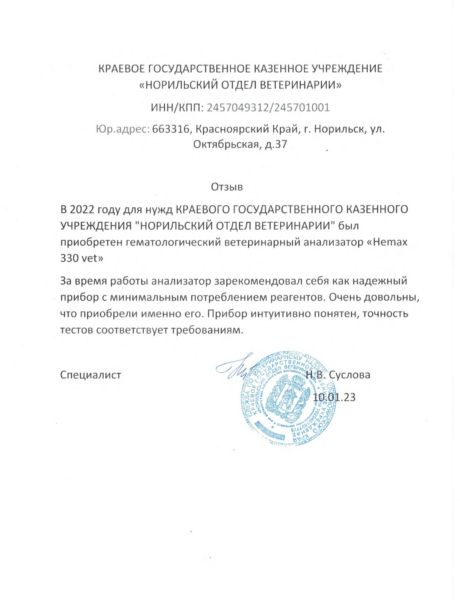 В 2022 году для нужд КРАЕВОГО ГОСУДАРСТВЕННОГО КАЗЕННОГО УЧРЕЖДЕНИЯ "НОРИЛЬСКИЙ ОТДЕЛ ВЕТЕРИНАРИИ" был приобретен гематологический ветеринарный анализатор «HEMAX 330 VET»