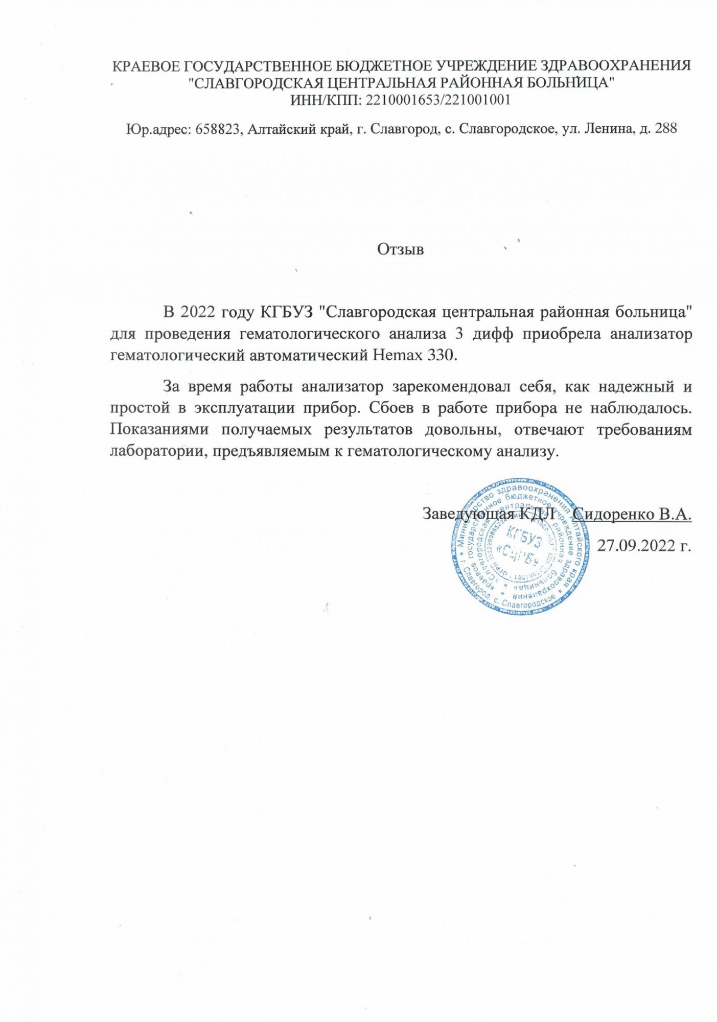 В 2022 году КГБУЗ "Славгородская центральная районная больница" для проведения гематологического анализа 3 дифф приобрела анализатор гематологический автоматический HEMAX 330.